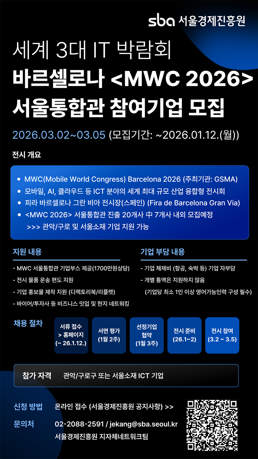 관악중소벤처진흥원에서는 관악S밸리 기업의 글로벌 시장 진출을 돕기 위하여 세계 3대 IT 박람회인 「 MWC 2026 서울통합관」에 관악 소재 참가 기업을 아래와 같이 모집하고 있습니다.