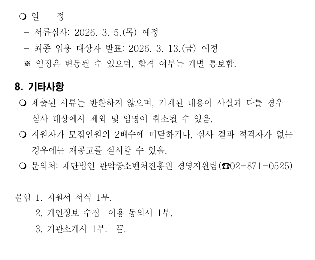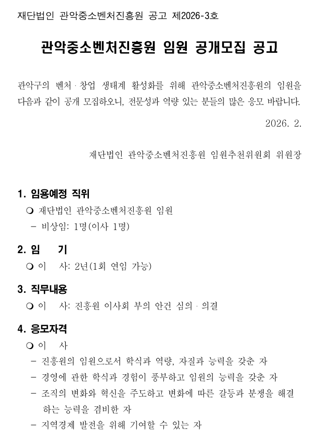 ○ 공 고 명: 2026년 제1차 관악중소벤처진흥원 임원 공개모집 공고