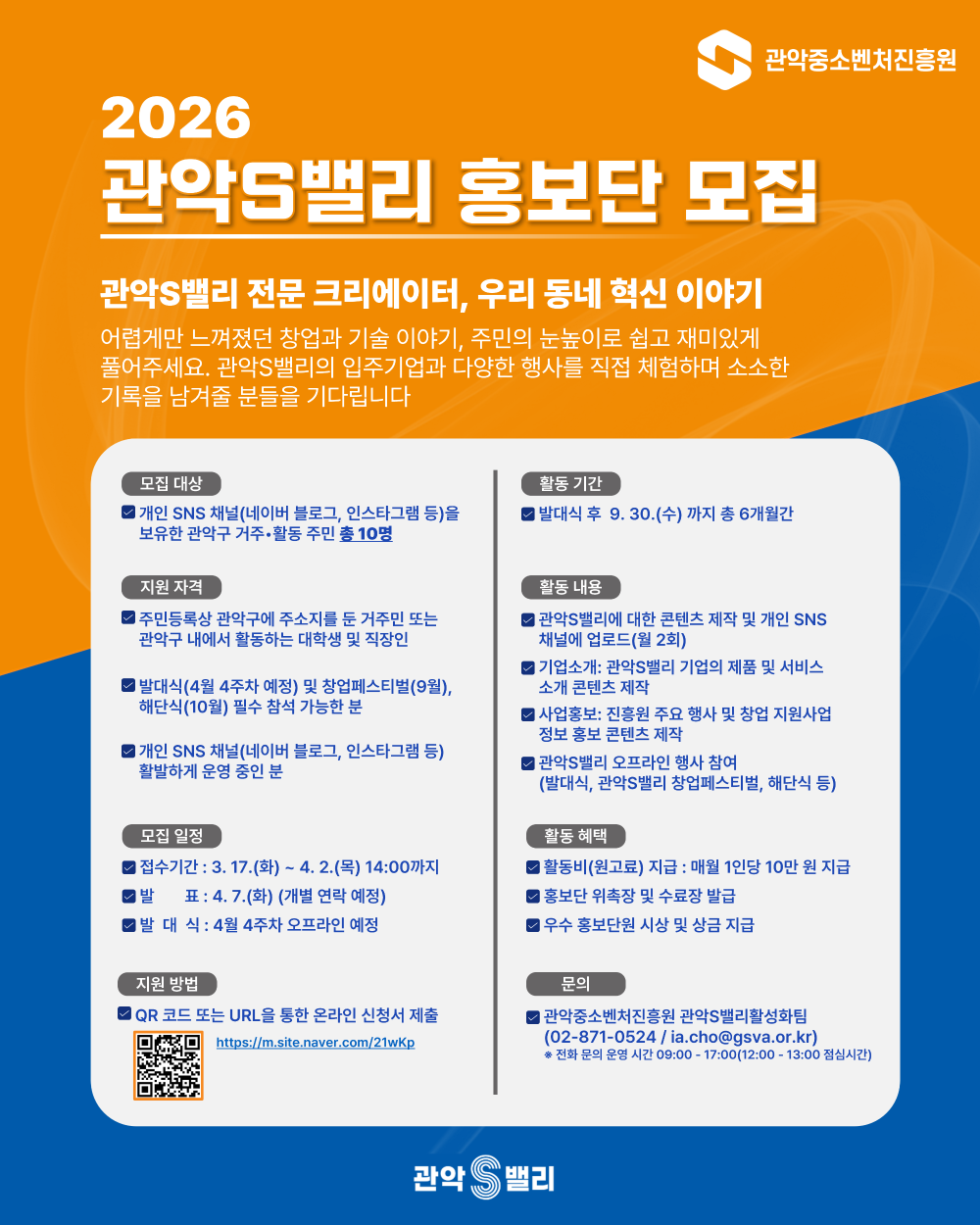 (재)관악중소벤처진흥원에서는 관악S밸리의 우수한 창업 인프라와 입주기업의 성과를 주민의 목소리로 생생하게 전달할 「2026 관악S밸리 홍보단」을 모집합니다.
